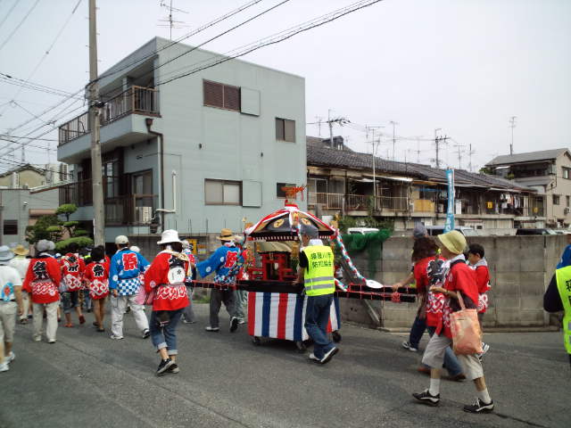 今日は朝から地元、萱島東3丁目の皆さんとみこしを引きながら、町内を練り歩いています。