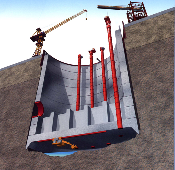 ニューマチックケーソン工法という施工方法で築造しています。この工事では、作業の能率向上と労働環境の改善を図るため遠隔操作による無人掘削、リアルタイムの計測情報の把握など最新技術を取入れています。