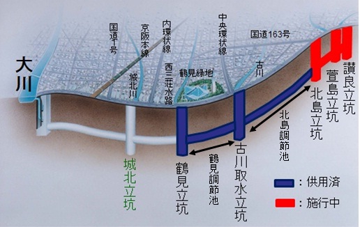 寝屋川北部地下河川は、河川や下水道の排水能力を超える雨水の放流施設であり、寝屋川市讃良を起点に河内平野の北部を流下し、大阪市都島区で大川に排水する計画です。