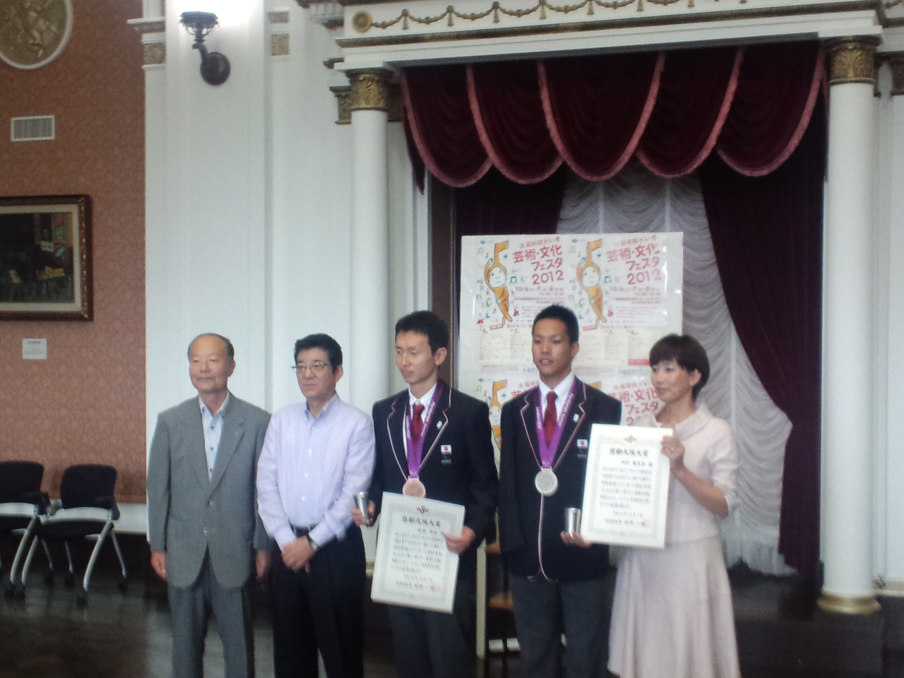 本日午前11時15分、大阪府庁にて、ロンドン2012パラリンピック競技大会 水泳100m平泳ぎで銀メダルを獲得された中村智太郎選手と陸上5000mで銅メダルを獲得された和田伸也選手に対し、松井知事から「感動大阪大賞」、中西教育長から「大阪スポーツ大賞」を贈呈されました。