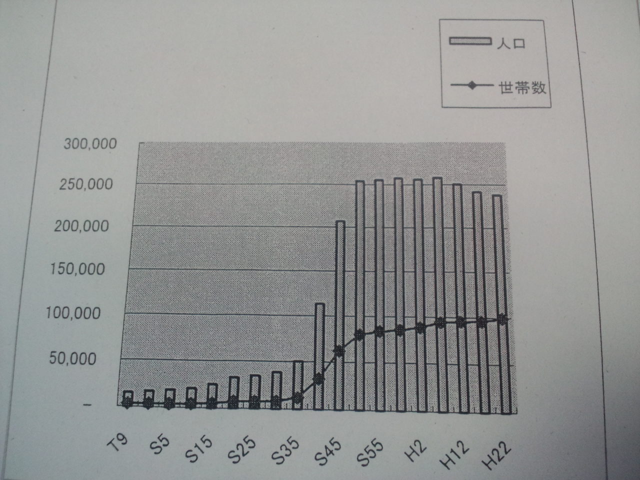 大正9年から増え続けた人口も、昭和60年の258,228人をピークに減少傾向にあるようです。