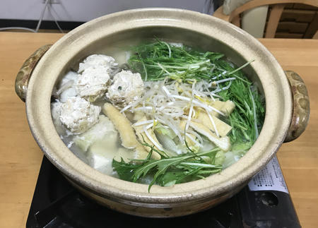 白菜、みずな、えのき、ブナしめじ、お豆腐、京揚げ、もやし、こんにゃくをざっくり入れて、出来上がり。