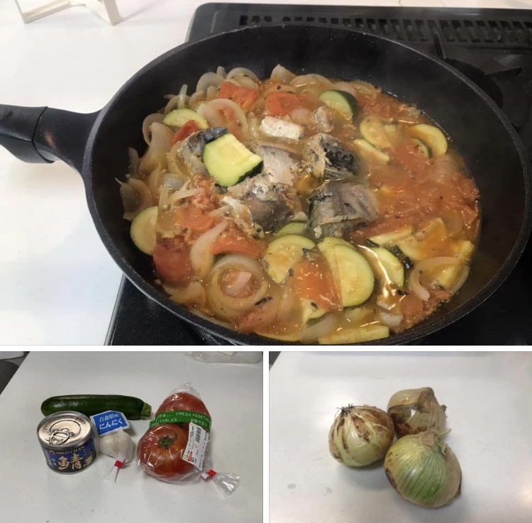 早朝、お裾分けいただいた新鮮な玉ねぎで『サバ缶とズッキーニのトマト煮』に挑戦