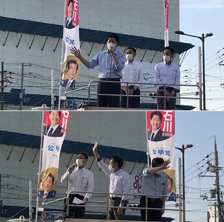 香里園駅前、石川ひろたか議員と公明党街頭演説会
