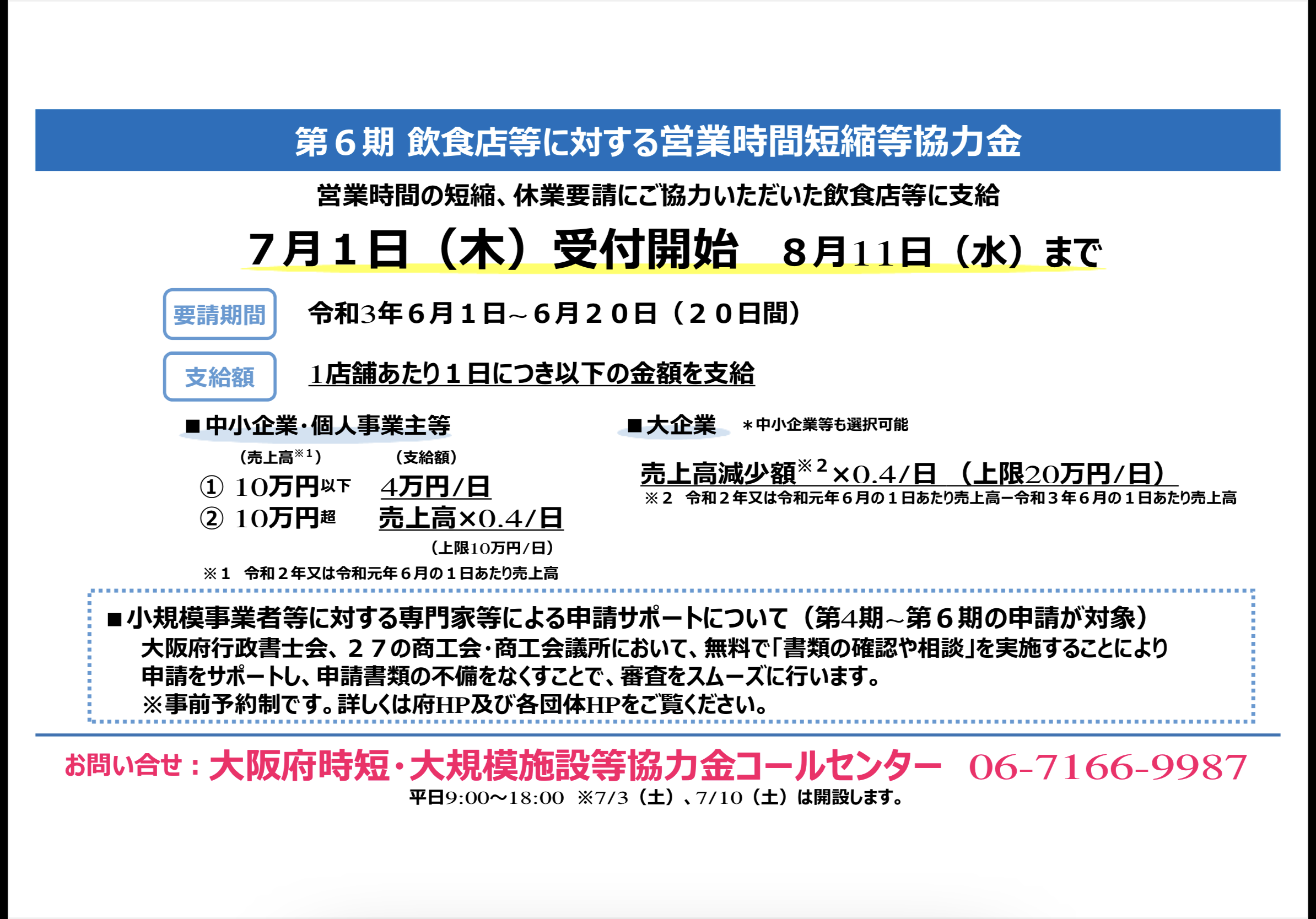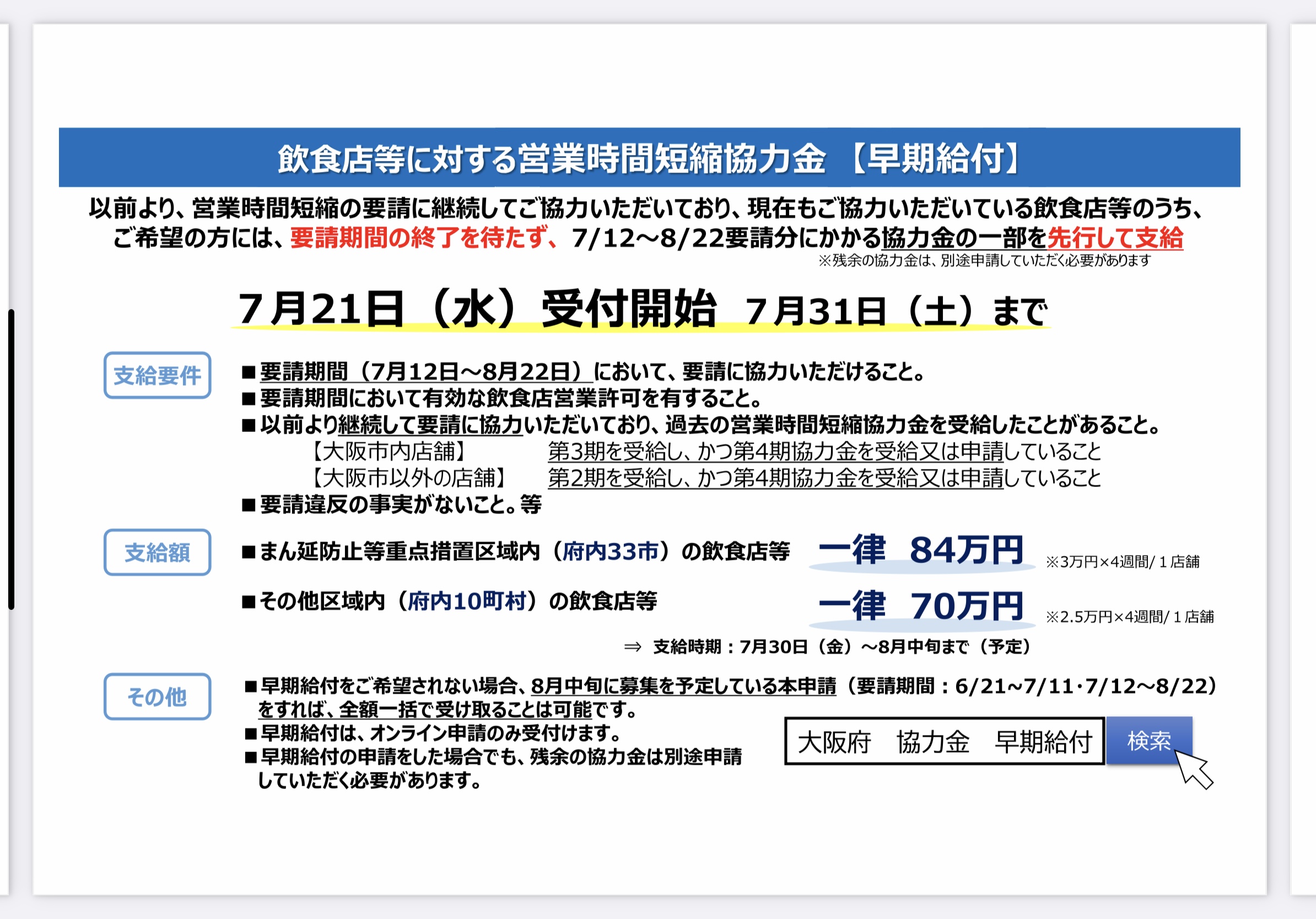 令和3年7月12日から8月22日の間、大阪府が行った営業時間短縮の要請にご協力いただける大阪府内の飲食店等に対して、要請期間の終了を待たずに営業時間短縮協力金の一部を早期給付することになりました。※すでに報道発表されています。