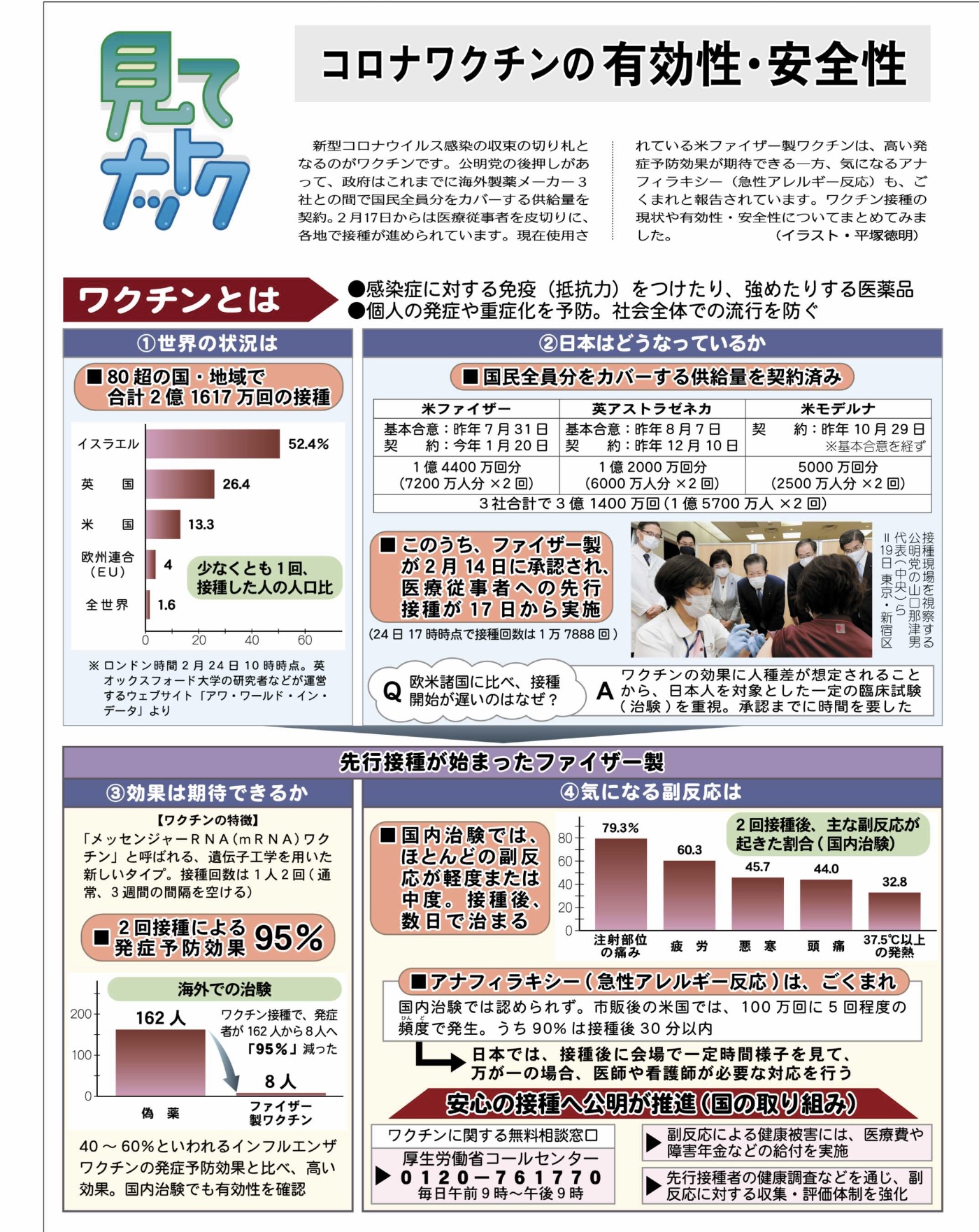 医療従事者に対するワクチン接種が始まり、4月12日からは65歳以上の高齢者への接種が開始される見込みとなり、重症化予防や感染拡大の防止効果に期待が寄せられています。