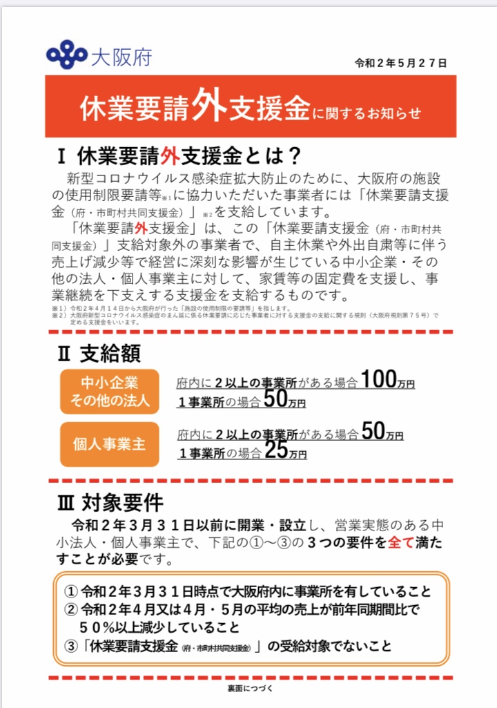 休業要請外支援金の詳細は5月27日、大阪府のホームページに掲載されます。