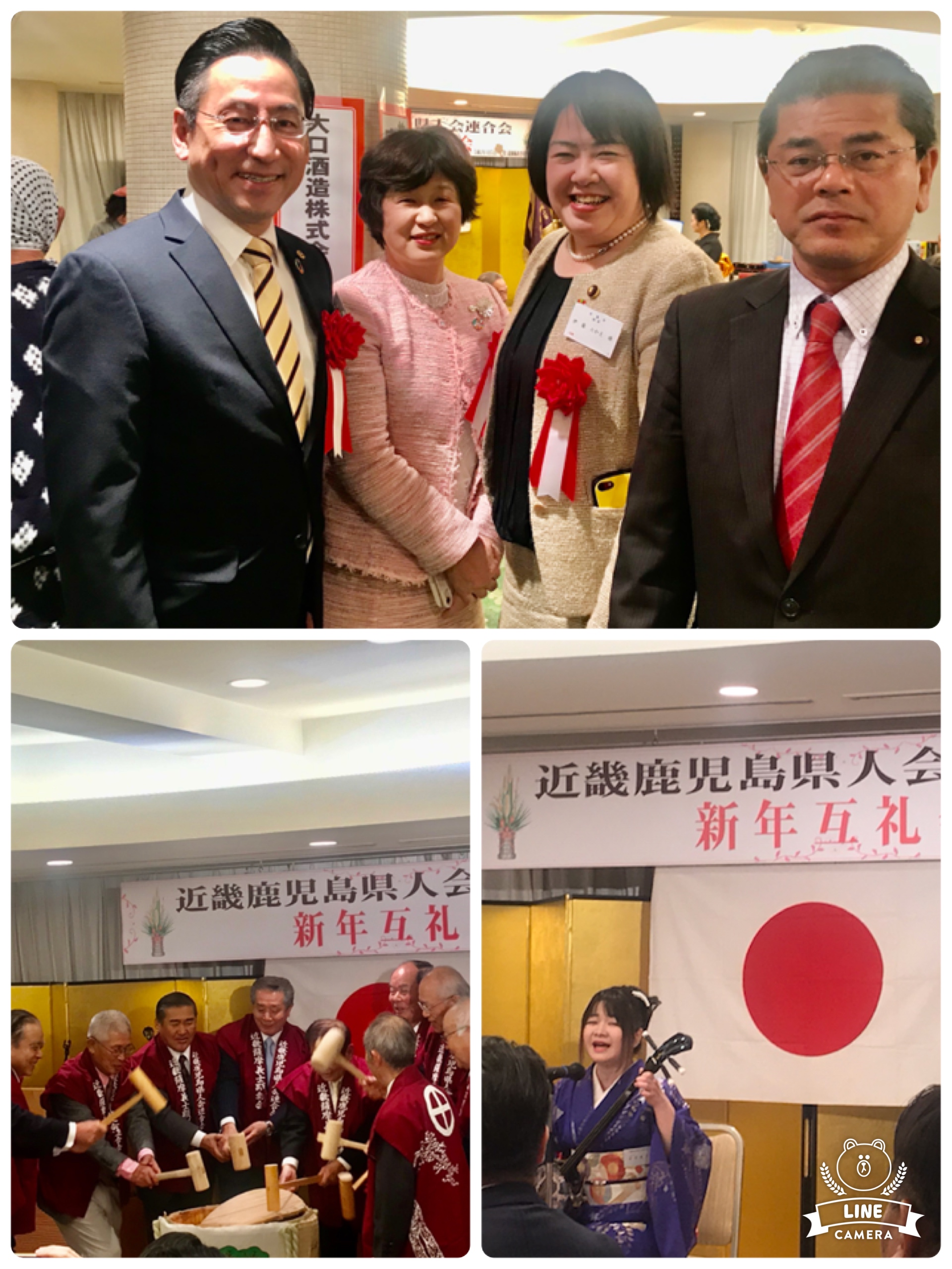 岩尾優子さんから三味線と奄美の祝い唄が披露され、鏡開きも見事に決まり、盛大に開催されました。