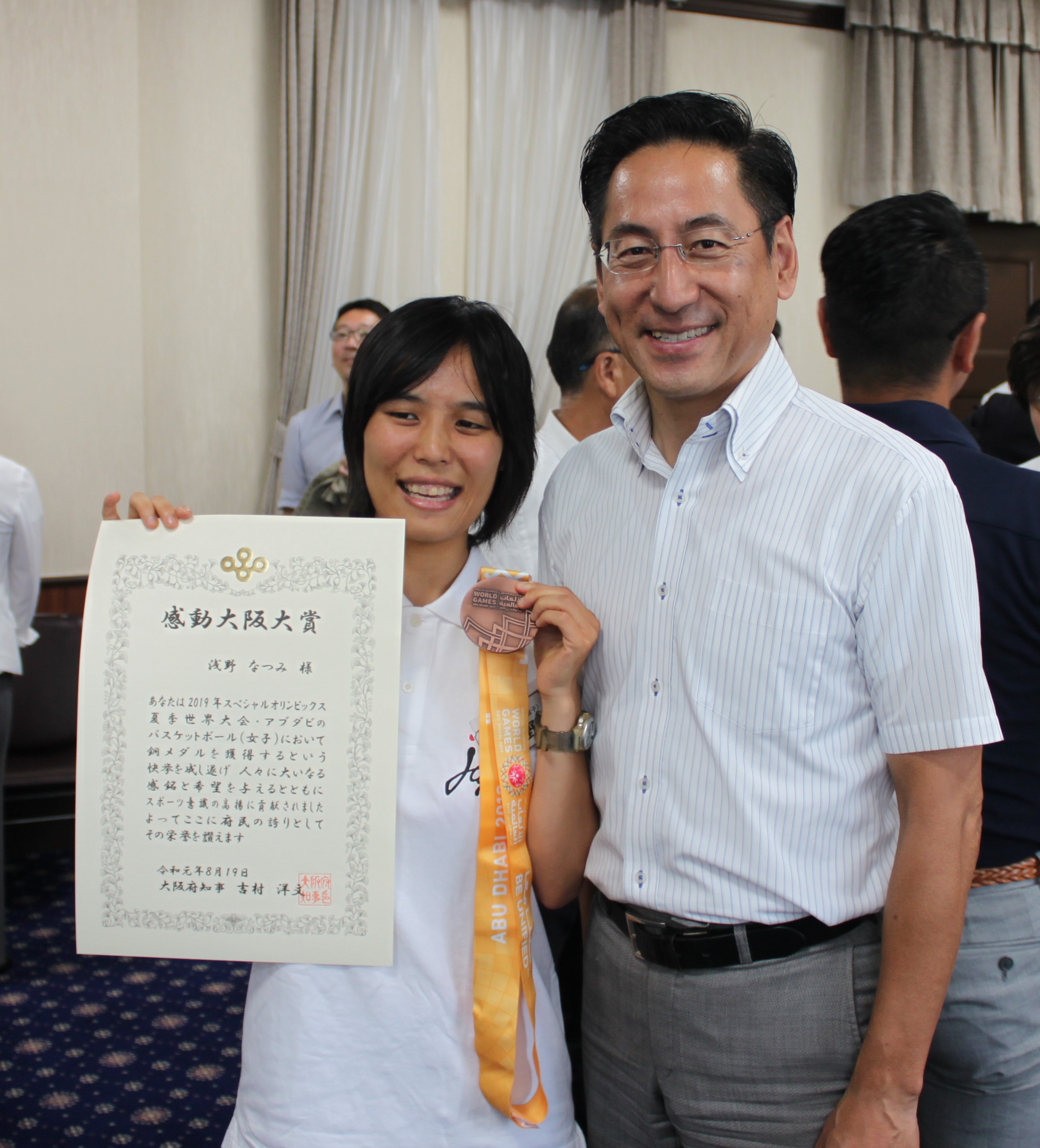 知的障がいのある選手たちによる4年に1度の「スペシャルオリンピックス夏季世界大会」(3月 アラブ首長国連邦アブダビ)でメダルを獲得した選手4名への感動大阪大賞贈呈式が、8月19日に大阪府庁で開催されました。