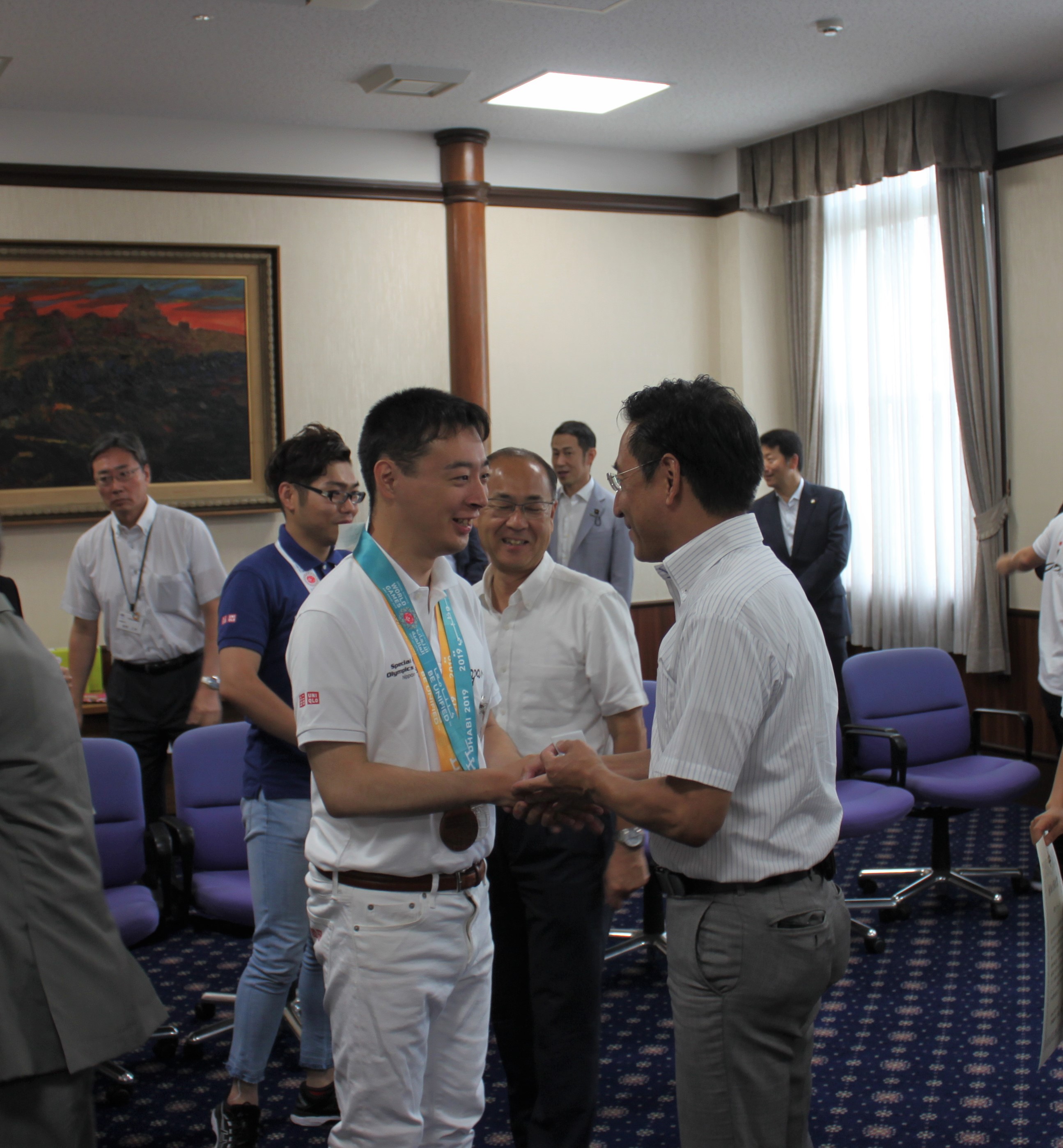 4名のうち、浅野なつみ選手と桑野晃宏選手は寝屋川市在住ということで贈呈式終了後、あらためてメダル獲得のお祝いをお伝えしました。