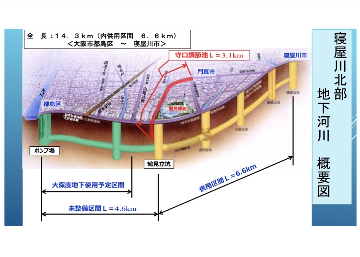 治水対策に大きな効果を発揮する地下河川は、最上流部の讃良立坑(寝屋川市)から鶴見立坑(守口市)までの6.6kmは平成27年度末に完成し、現在、貯留施設として使用されています。
