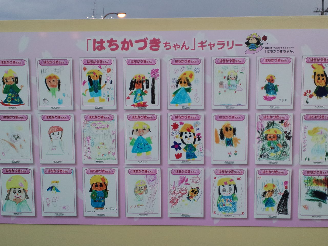 緑町のイオンモールと国道170号線沿いににかかっている歩道橋の側面に、寝屋川市のマスコットキャラクターの『はちかづきちゃん』の絵が展示されていました。