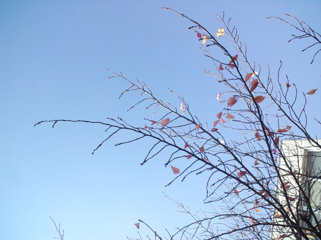 今日も、元気いっぱいに挨拶廻りをしています! ここ数日から冷えてきましたが、今日は、雲一つない素晴らしいお天気でした! 紅葉した桜の木の下から青空を撮りました! 来年の春には、見事な花を咲かす桜の木も、今は厳しい冬に備え、耐えているようです。 鍛えの時があって、植物も人も成長するのだと思う今日この頃です。
