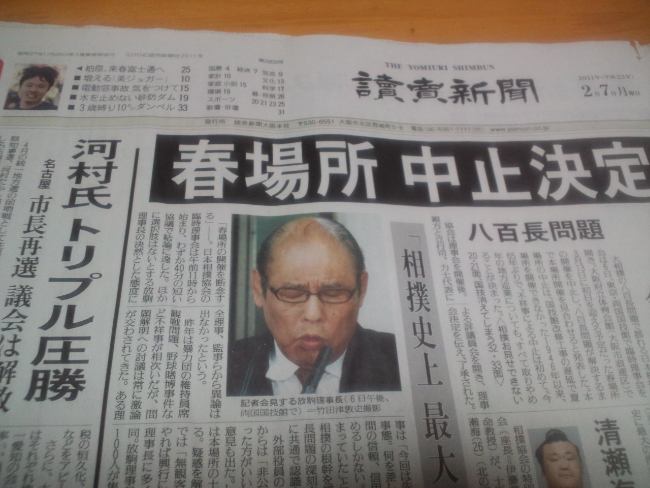 大相撲の春場所の中止決定の記事が、一面に載りました。